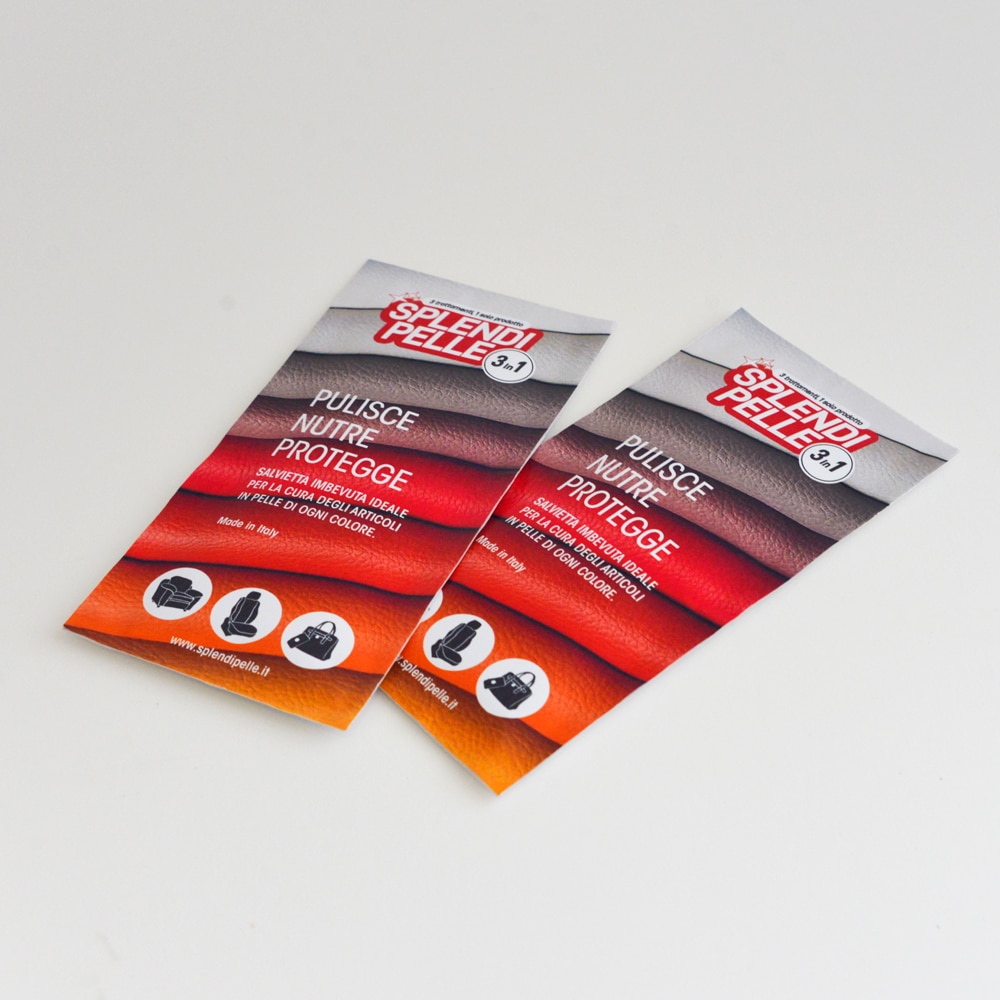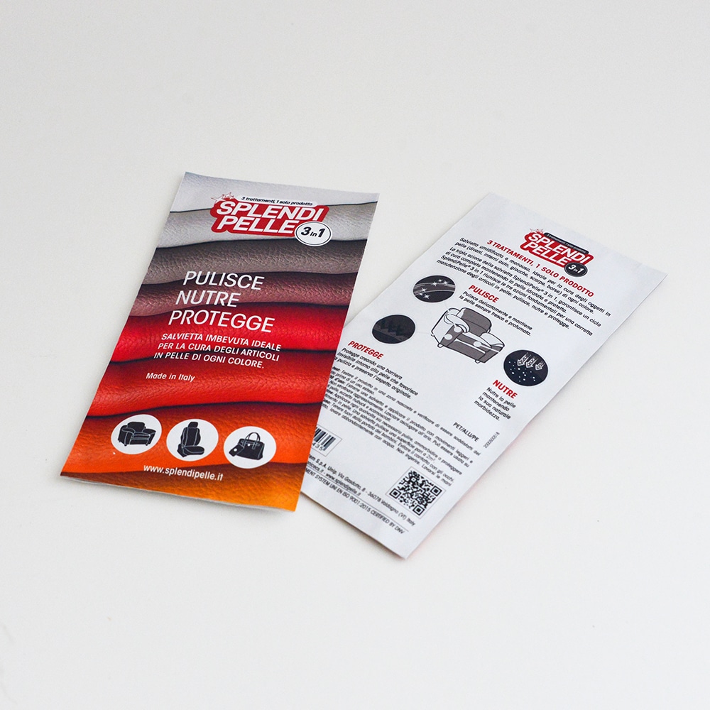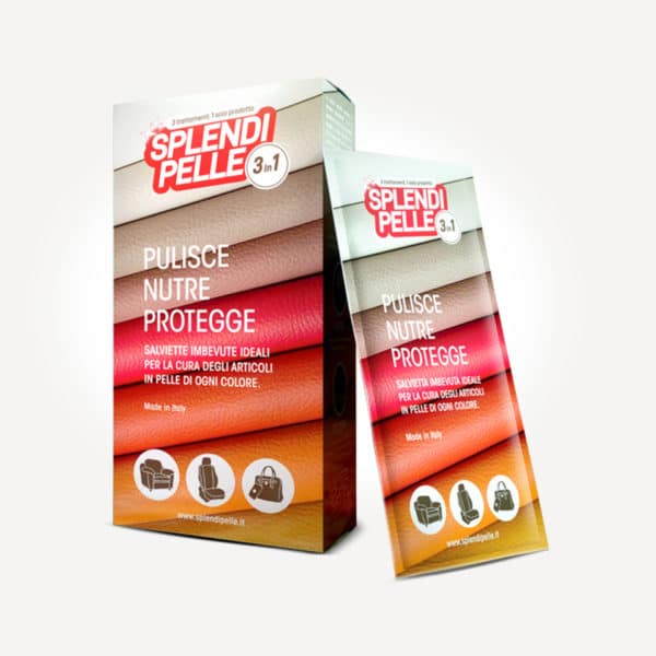 Splendipelle ® 3 in 1 è il trattamento unico per articoli in pelle (divani, interni auto, giacche, scarpe, borse). La pratica salvietta imbevuta e monouso garantisce un ciclo di cura completo, semplice e veloce, riunendo le tre azioni fondamentali per una corretta manutenzione degli articoli in pelle: